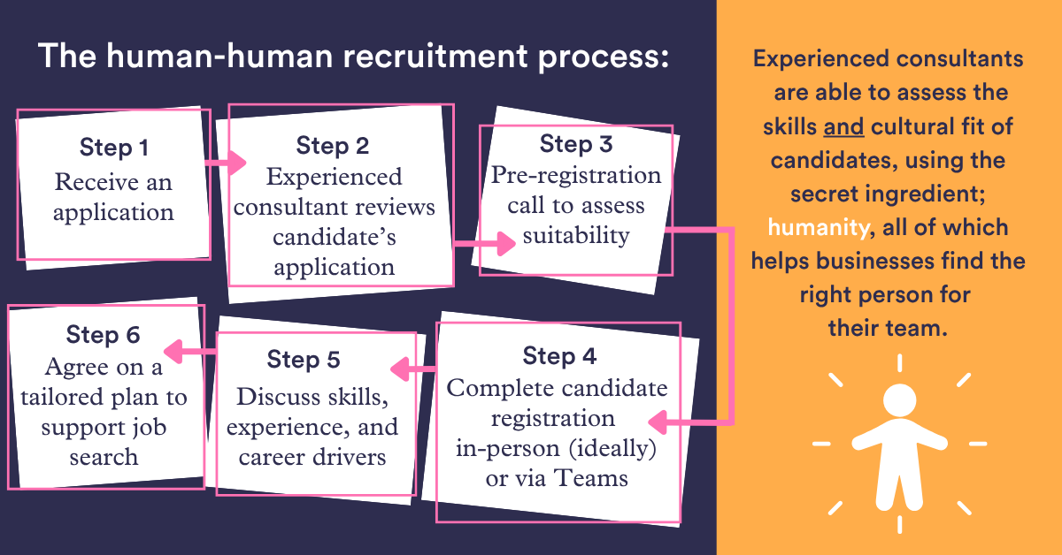 Meeting a candidate means that the recruiter can bring their insight to the screening table, and this can only be gained from meeting them person-to-person. Experienced consultants are able to assess the skills and cultural fit of candidates, using the secret ingredient of humanity, all of which helps businesses find the right person for their team.